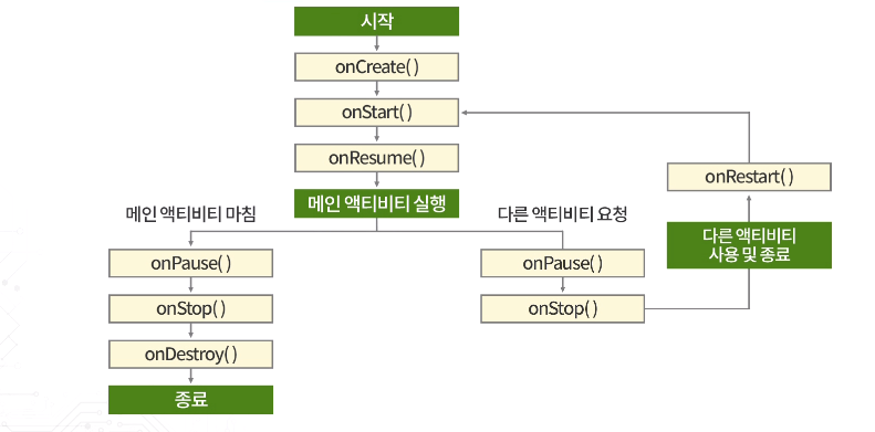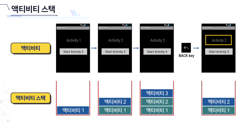- 안드로이드 응용프로그램은 동시에 여러 개의 액티비티가 나올 수 없어 앞에 나온 화면 하나만 활성화된 상태이고 나머지는 모두 비활성화 상태