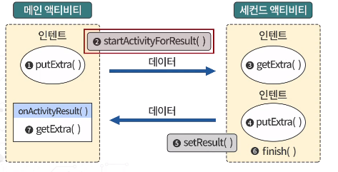 - 메인 액티비티에서 두 번째 액티비티로 데이터를 넘긴 후에 다시 돌려주는 경우