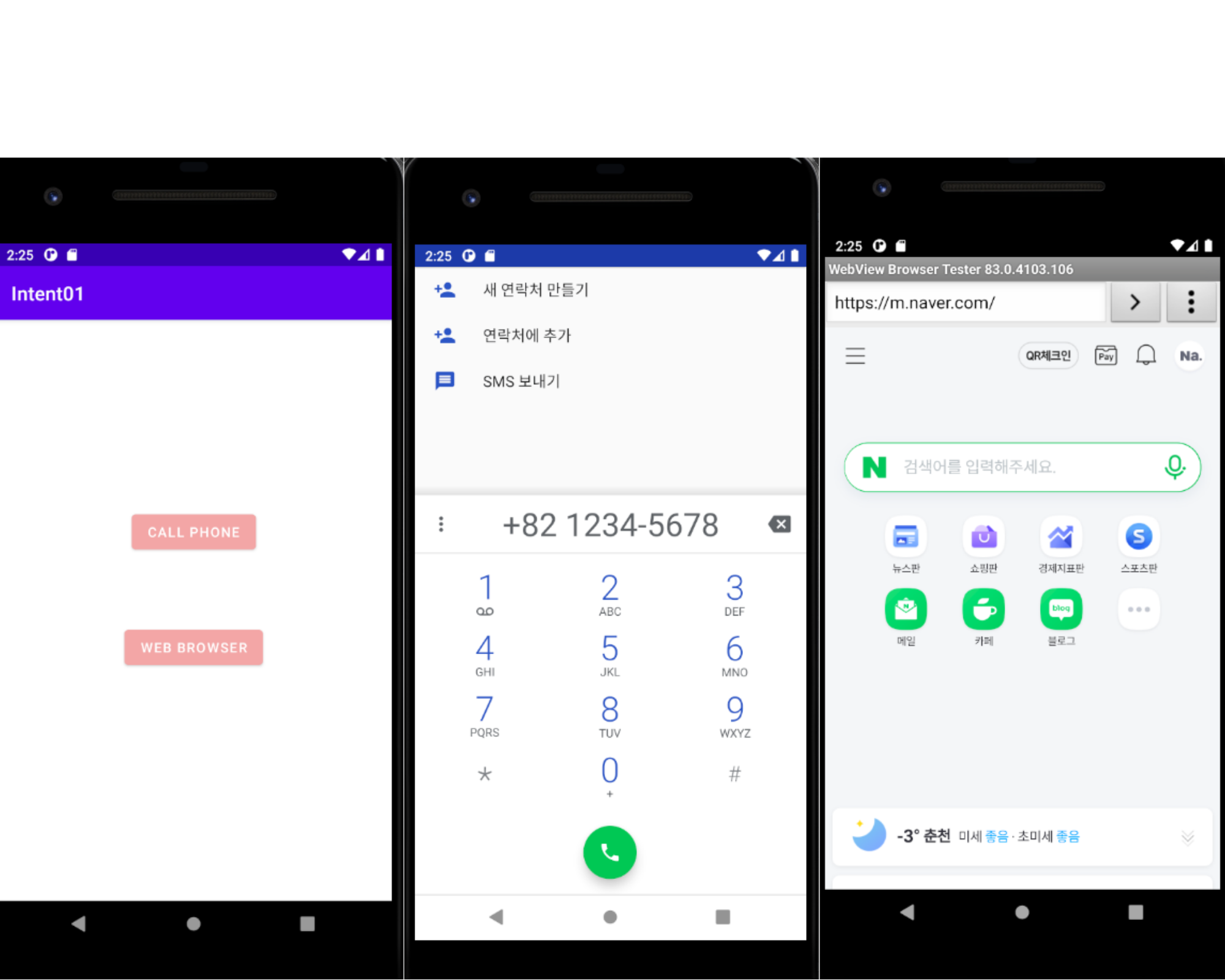- ACTION_DIAL : 전화번호를 누르는 화면을 표시