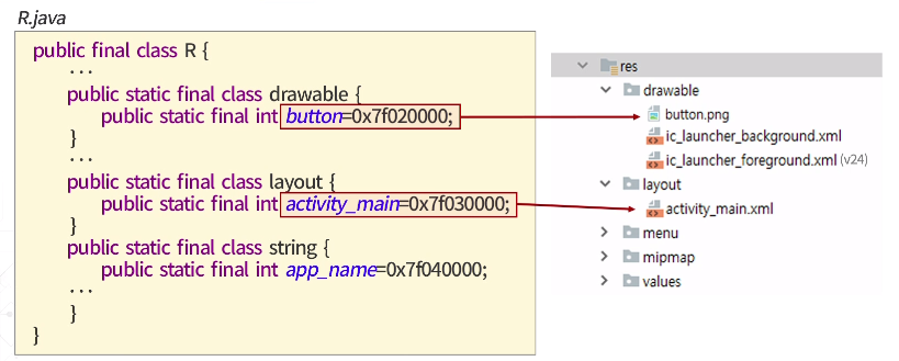 - res폴더에 정의된 리소스의 아이디(파일명, 이름) 저장